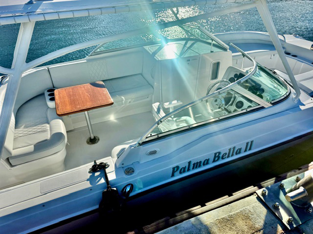 Palma Bella is a 27 ft World Cat power catamaran boat that is full efficient and that cuts smoothly across even choppy waters, assuring you an affordable and comfortable cruise. She has a large bimini top for shade, open bow with sun lounge, and a swim platform for easy off-shore snorkeling. Our boats are equipped with Blue Tooth stereo systems, so you can be the DJ playing your favorite playlist. Coast Guard approved, they are a smooth and safe ride for up to 8 guests.